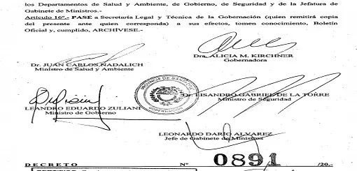 El Decreto consta de 16 artículos y está firmado por la gobernadora, Alicia Kirchner, el Jefe de Gabinete, Leonardo Álvarez; y los ministros de Salud y Ambiente, Juan Carlos Nadalich; de Gobierno, Leandro Zuliani; y de Seguridad, Lisandro de la Torre. El mismo entra en vigencia a partir del 3 de agosto de 2020.