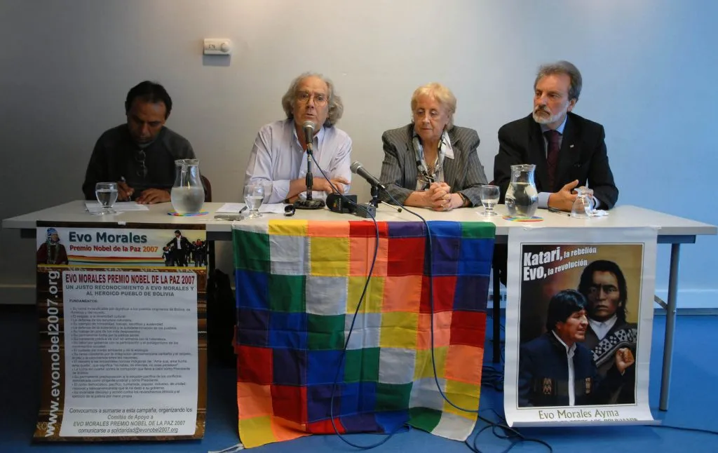 - Télam Buenos Aires 16/03/2010 Luis Romero, representante del movimiento indìgena en el Cerpaj, Adolfo Pérez Esquivel, la periodista Estela Calloni y el director del Centro Cultural de la Cooperación, Juan Carlos Junio (de izquierda a derecha) en la postulación del presidente boliviano Evo Morales como premio Nobel de la Paz para 2010. Foto: Candelaria Lagos/Télam/jcp