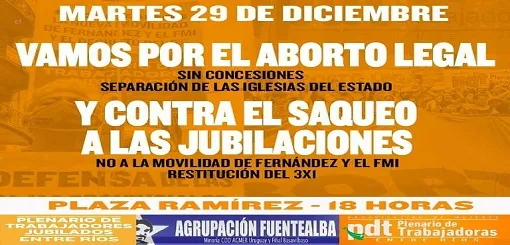 "Las mujeres movilizadas, los trabajadores y jubilados salimos a romper con esta maniobra del gobierno. Vamos por el aborto legal, sin concesiones y por la separación de las iglesias del Estado. También contra el nuevo saqueo a las jubilaciones, contra la nueva movilidad antijubilatoria de los Fernández y el FMI, derogación de la ley “solidaria” de Bordet, restitución del 3 x 1, por el 82% móvil y movilidad automática por inflación o mejor sueldo".