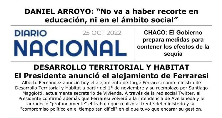 A través de la red social Twitter, el Presidente confirmó además que Ferraresi volverá a la intendencia de Avellaneda y le agradeció "profundamente" el trabajo que realizó al frente del ministerio y su "compromiso político en el tiempo tan difícil" en el que tuvo que encarar su gestión.