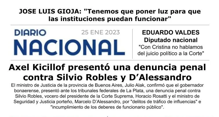 El gobernador bonaerense, Axel Kicillof, presentó ante los tribunales federales de La Plata una denuncia penal contra Silvio Robles, vocero del presidente de la Corte Suprema, Horacio Rosatti, y el ministro de Seguridad y Justicia porteño, Marcelo D’Alessandro, por "delitos de tráfico de influencias" e "incumplimiento de los deberes de funcionario público". En ese sentido, el ministro de Justicia de la provincia de Buenos Aires Julio Alak explicó que la decisión del gobernador es en defensa de los vecinos de la provincia que se ven perjudicados por el fallo de la Corte respecto a la coparticipación que recibe la Ciudad Autónoma de Buenos Aires.