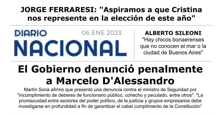 Soria afirmó que presentó una denuncia contra el ministro de Seguridad por "incumplimiento de deberes de funcionario público, cohecho y peculado, entre otros". "La promiscuidad entre sectores del poder político, de la justicia y grupos empresarios debe investigarse en profundidad a fin de garantizar el cabal cumplimiento de la Constitución”.