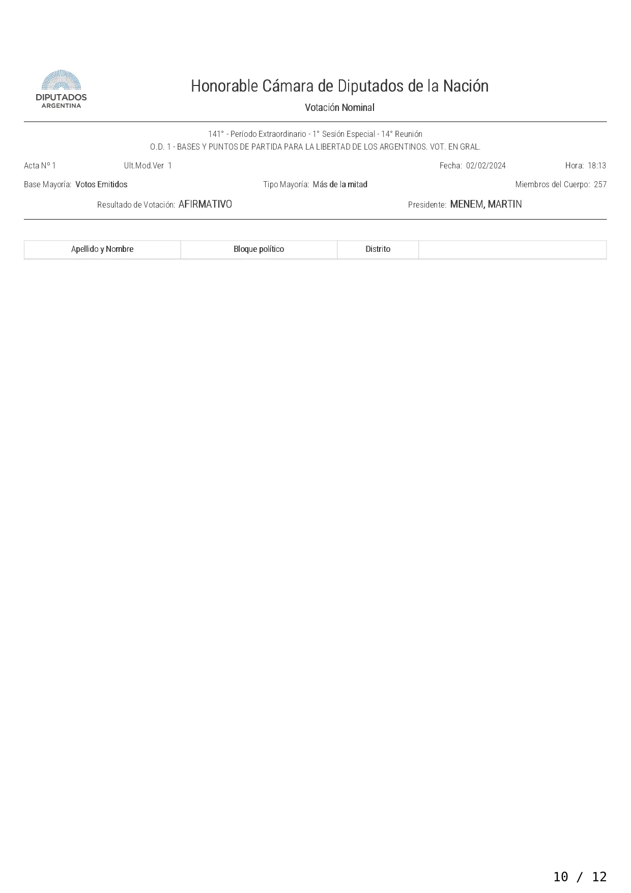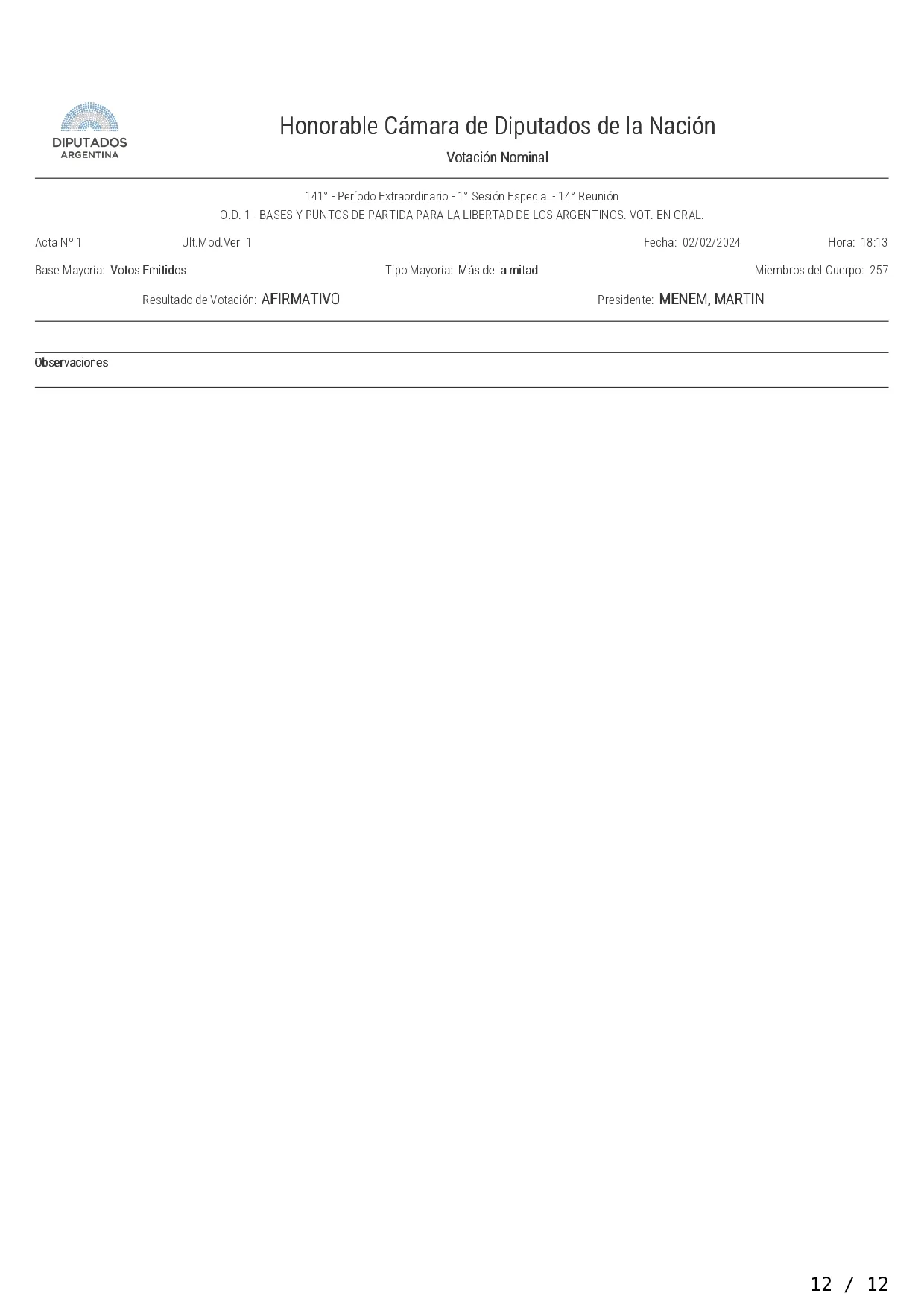 La Cámara de Diputados aprobó en general por 144 votos contra 109 el proyecto de ley "Bases y Principios para la Libertad de los Argentinos", que establece una emergencia pública, una reforma del Estado y la privatización de varias empresas públicas, y pasó a cuarto intermedio hasta el martes próximo a las 14 para el tratamiento de la iniciativa artículo por artículo.