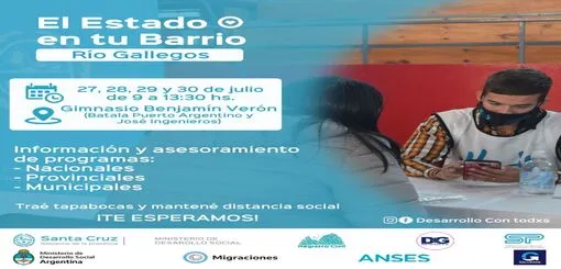 Desde mañana martes 27 al viernes 30 de julio el dispositivo de “El Estado en tu Barrio” estará ubicado en el Gimnasio Benjamín Verón para brindar asesoramiento sobre los programas y líneas de acción.