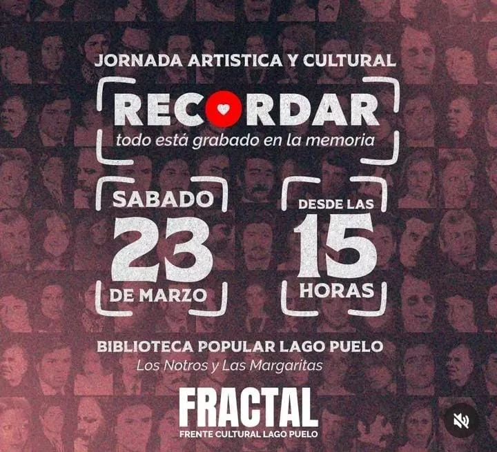 El Frente de Artistas y Trabajadores de la cultura de Lago Puelo, FRACTAL (espacio que nació como organización ante las medidas del gobierno nacional), propone distintas actividades para conmemorar el próximo 24 de marzo, día de la Memoria, Verdad y Justicia. El jueves 21 de marzo a las 20hs se realizará una nueva edición del ciclo de cine itinerante en el Club Frontera, en tanto que el sábado 23 desde las 15hs en la Biblioteca Popular Lago Puelo se concretara una Jornada Artistica Cultural, “Recordar, todo está grabado en la memoria”. Los detalles los dio Augusto Campos, artista, músico y miembro de FRACTAL.