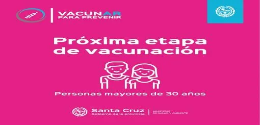 A partir de la jornada de hoy, se da inicio a la etapa vacunación a personas mayores de 30 años sin restricciones, mayores de 18 años con enfermedades crónicas de alto riesgo y mujeres gestantes de más de 18 años, la aplicación se realizará en los distintos centros de vacunación dispuestos en la ciudad de Río Gallegos.