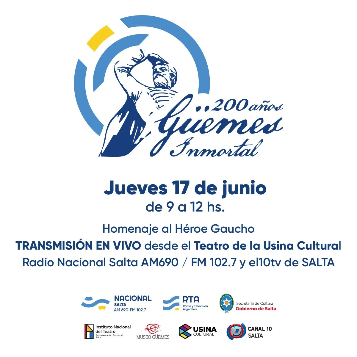 Este jueves 17 de junio de 9 a 12, Radio Nacional Salta junto a la Secretaria de Cultura de la Provincia realizarán el programa especial "200 Años, Güemes Inmortal" en vivo desde el teatro de la Usina Cultural.