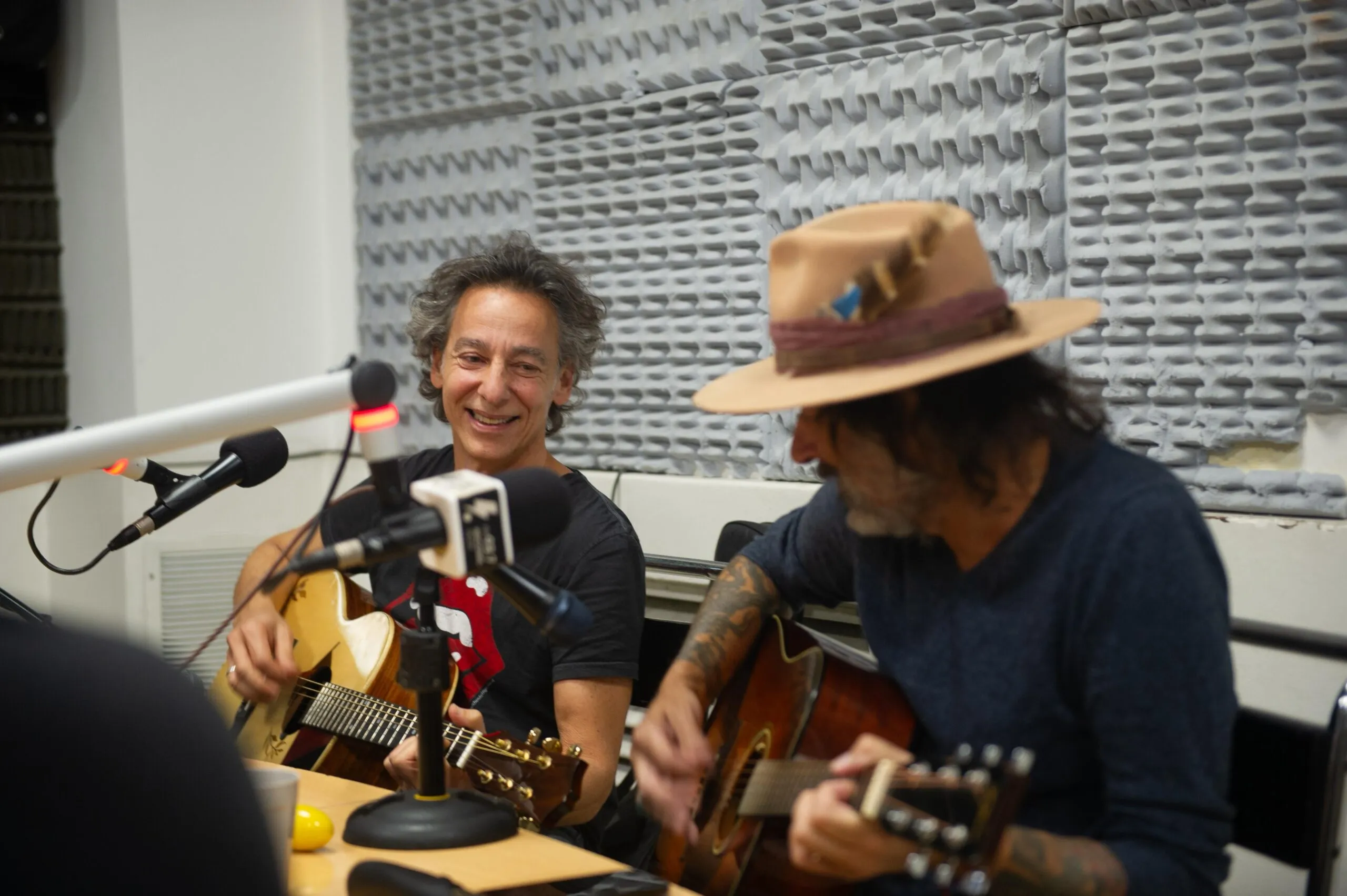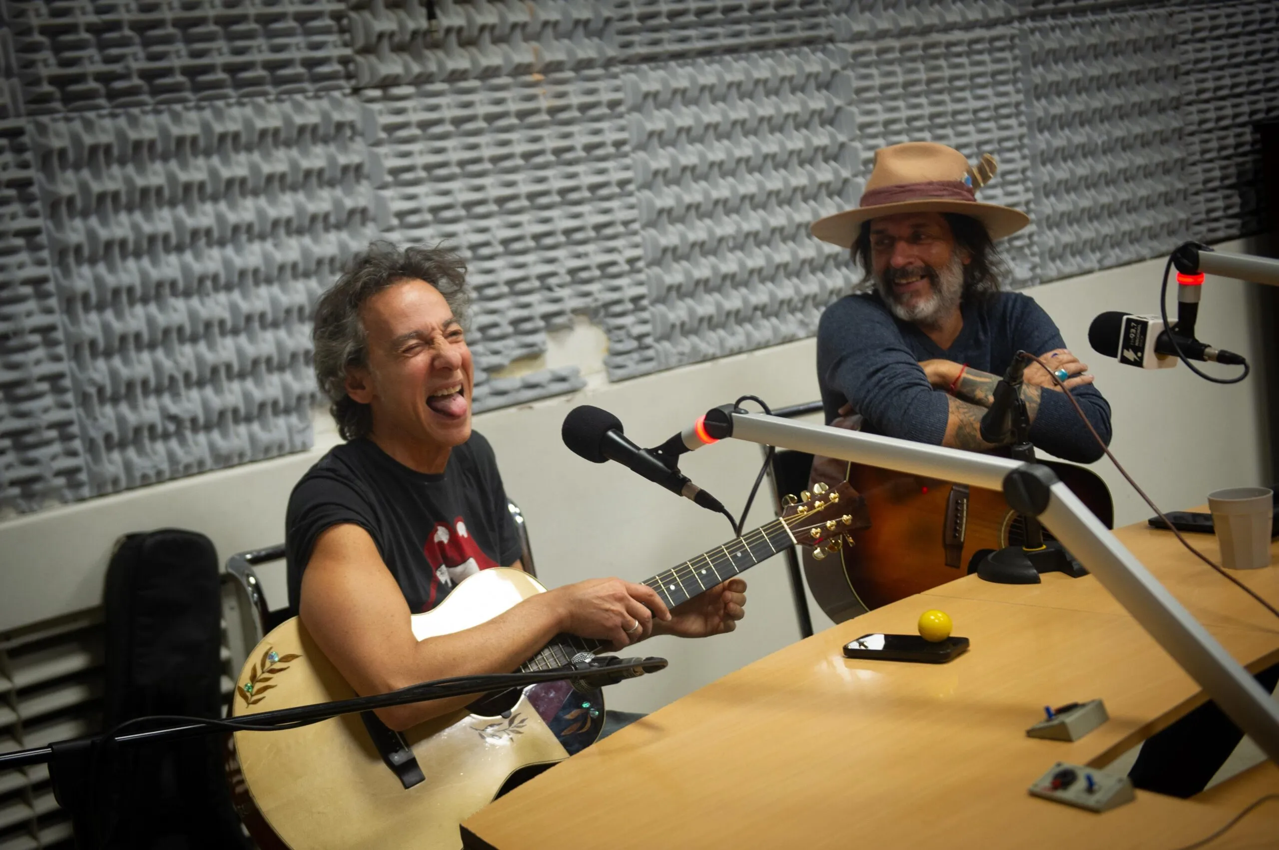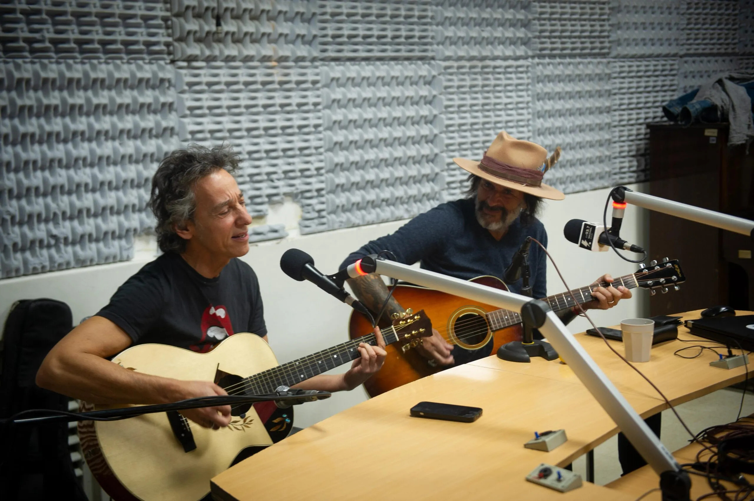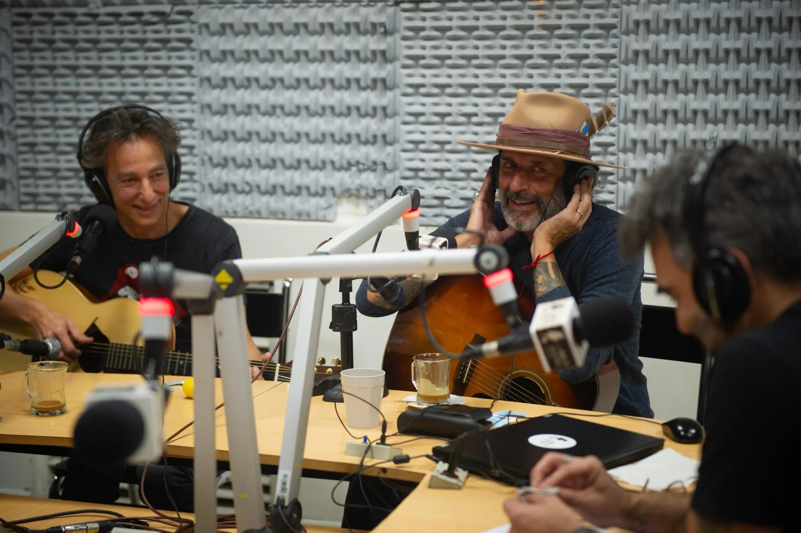 Hasta con una participación telefónica del guitarrista Sergio Berdichevsky (Rata Blanca, Nativo, Rowek), los artistas tomaron sus guitarras para visitar “Mujeres y vino” y, tras un café con leche con medialunas solicitado por Calamaro, hubo más: una versión combinando “El tren de las 16” (de Pappo) con “Me gusta ese tajo” (del Spinetta de Pescado Rabioso) y los propios “Rosas en tu pecho” y “W.P.M.” que estiraron la emisión hasta pasadas las 12.30.