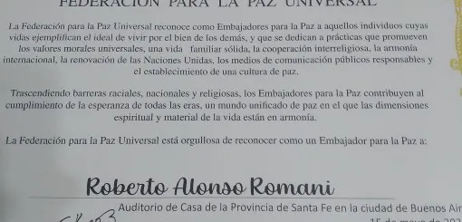 El licenciado Roberto Romani fue distinguido en Buenos Aires como Embajador para la Paz.
